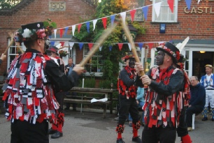 Datchet Border Morris have been performing for more than five decades (not necessarily with the same cast!). Border Morris comes from the counties bordering on Wales and the black faces and rags are believed o have evolved to preserve the anonymity of men performing an annual ritual dance to bring fertility to the land each spring. Nothing to worry about girls! This Morris side perform with a verve and gusto sure to raise a thirst! |